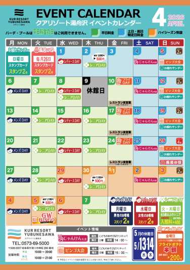 隣接のクアリゾート湯舟沢4月イベントカレンダーです。